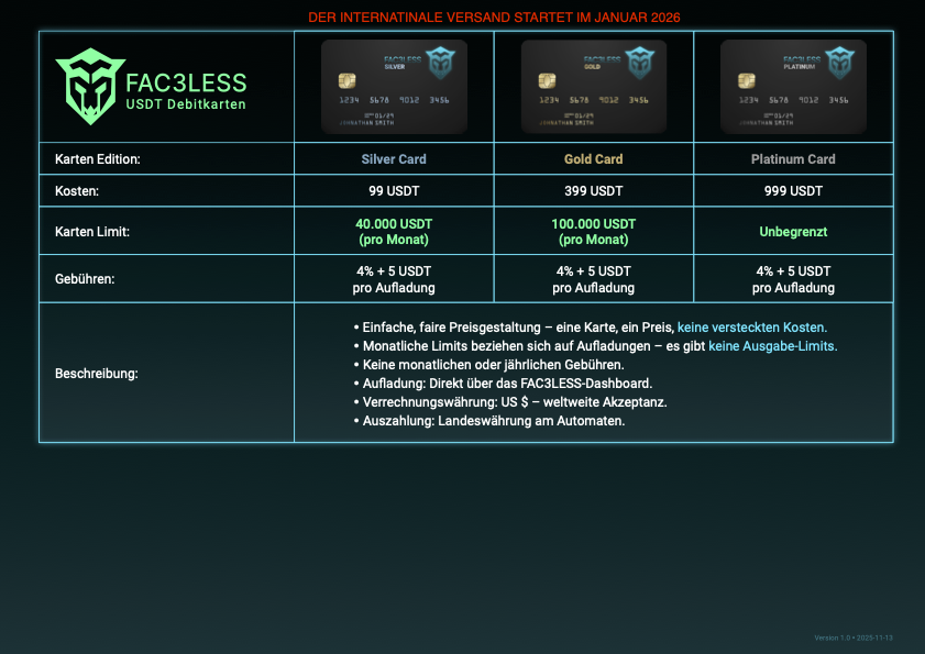 Eine Lösung, die dieses Problem adressieren will, ist die FAC3LESS USDT-Debitkarte. In diesem Artikel schauen wir uns sachlich und praxisnah an, wie das Modell funktioniert, wo die Vorteile liegen – und für wen sich die Nutzung wirklich lohnt.